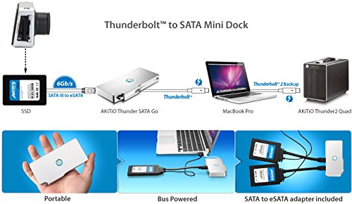 AKiTiO Thunder SATA Go The AKiTiO Thunder SATA Go features an all-aluminum, unibody design. It allows users to connect their SATA storage and RAID devices, but does so in an extremely portable, bus powered solution. The Thunder SATA Go can also be used to connect an SSD directly to a laptop computer so that content editing can be done in the field with transfer speeds of up to 530MB/s. High-Speed I/O Performance With the extremely fast throughput performance of the Thunderbolt connection and the 6Gb/s eSATA interface, solid state drives (SSD's) can run at full SATA-III speeds. A single SSD can reach speeds of up to 530MB/s and if two SSD's are combined in a RAID array, transfer rates can go even higher. Portable and Bus Powered This sleek and compact Thunderbolt to SATA mini dock runs on bus power alone without the need for external power. Hassle-free with its tethered Thunderbolt cable and noiseless, this Thunderbolt to eSATA adapter is the ideal companion for your notebook. SSD Reader The included SATA cable with USB power provides filmmakers with the ability to connect any SSD, straight from their camera, regardless of brand or capacity, directly to their laptop without it needing to be plugged into a power outlet. When you're on a deadline, every second counts. Raw data on an SSD can be passed along to a DIT for editing and the filmmaker can insert a new SSD into the camera and continue filming at the same time that editing is taking place.Feature