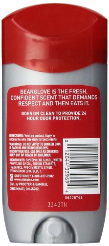 -. Binding : Health and Beauty -. Brand : Old Spice -. Label : Old Spice -. Manufacturer : Old Spice -. ProductGroup : Health and Beauty -. ProductTypeName : HEALTH_PERSONAL_CARE -. Publisher : Old Spice -. Studio : Old Spice -. Title : Old Spice Wild Collection Bearglove Men's Deodorant 3 Ounce