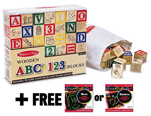 -. Binding : Toy -. Brand : Melissa & Doug -. EAN : 9899999562610 -. Feature : ONE FREE Melissa & Doug Scratch Art Mini-Pad is bundled with this item. The style of the mini-pad you receive is randomly picked. / Another great toy from Melissa & Doug for early childhood. / 50-piece wooden ABC & 123 block cart play set provides hours of enriching play for your toddler! / Features 50 solid wood traditionally styled one inch cube blocks with charming hand-drawn colorful artworks, encourages association, stacking, sequencing and sorting. / A tremendous value that will last for years! For age 2+. -. IsAdultProduct : 0 -. Label : Melissa & Doug -. Manufacturer : Melissa & Doug -. MPN : BCC9NW10 -. PackageQuantity : 1 -. PartNumber : BCC9NW10 -. ProductGroup : Toy -. ProductTypeName : TOYS_AND_GAMES -. Publisher : Melissa & Doug -. Studio : Melissa & Doug -. Title : Deluxe 50-piece Wooden ABC & 123 Blocks Set + FREE Melissa & Doug Scratch Art Mini-Pad Bundle [19002]