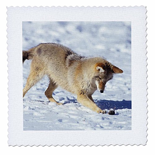3dRose Captive Coyote in Winter Snow, Playing with Mouse, Montana Quilt Square, 10 x 10"