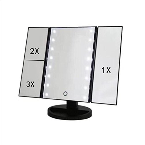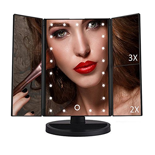 Three Panel 22 LED Lights 180 Degree Free Rotation with 1x/2x/3x Countertop Cosmetic Makeup Mirror/Lighted Travel Mirror/Pocket Mirror (Black)