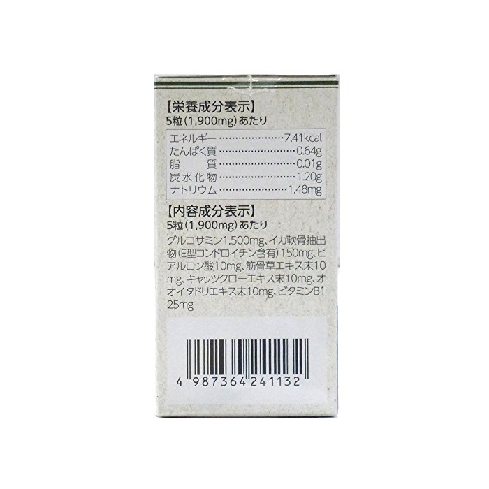 【배합 성분】5알(1900mg)근처 《구루코사민》1500mg,물오징어 연골 추출물(E형 (chondroitin)콘드로이틴 함유)150mg,히알론산10mg,근골초 엑기스말10mg,캣츠 크로《―에키스》말10mg,《오오이타도리에키스》말10mg,비타민B1 25mg