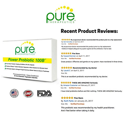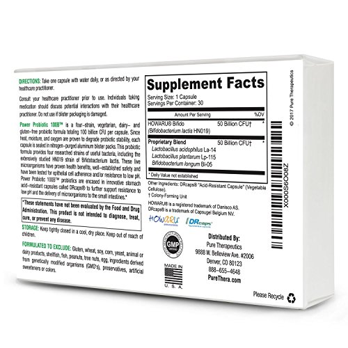 Power Probiotic 100B is a four-strain vegetarian, dairy- and gluten-free probiotic totaling 100 billion CFU† per capsule. Since heat, moisture, and oxygen are proven to degrade probiotic stability, each capsule is sealed in nitrogen-purged aluminum blister packs to assure viability. This probiotic formula provides four researched strains of useful bacteria, including the extensively studied HN019 strain of Bifidobacterium lactis. These live microorganisms have proven health benefits and well-established safety, and have been tested for epithelial cell adhesion and/or resistance to low pH. Power Probiotic 100B probiotics are encased in innovative stomach acid resistant capsules called DRcaps to further support resistance to low pH and the delivery of microorganisms to the small intestines. No refrigeration needed! All Pure Therapeutics Formulas Meet or Exceed cGMP Quality Standards. This product is manufactured in the United States in a GMP-certified facility.Feature