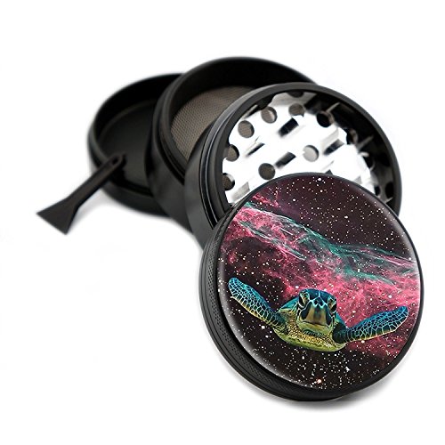 Space Turtle Herb Grinder 4 Piece Premium Black Aluminum Metal Grinders 2.5" 63mm - Easily Grind Herbs and Spices! Green Turtles - Gift Box