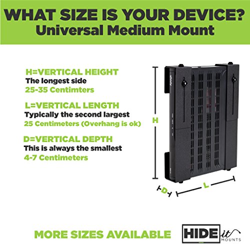 CHECK YOUR DIMENSIONS. Adjustable to fit a wide variety of devices. Vertical Height: 10" to 13.95" - Minimum Vertical Length 7" (Overhang is fine) Vertical Depth 1.5" to 2.75" If your device is larger or smaller, there are other HIDEit models to fit your device!