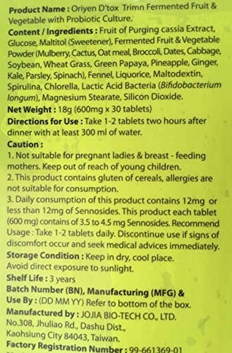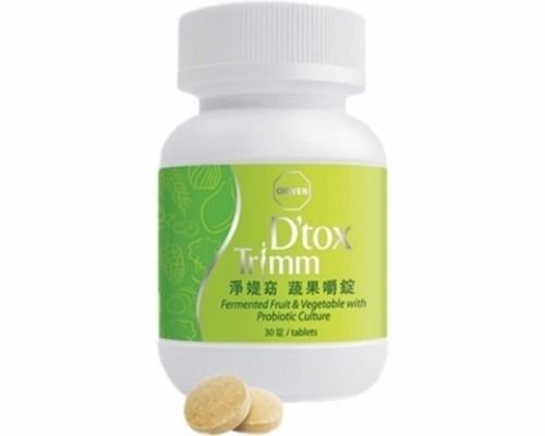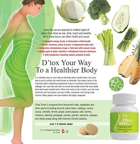 D'tox Trimm is prepared from fermented fruits, vegetables and other plants (including broccoli, black dates, cabbage, cactus, cassia, chlorella, fennel, ginger, green papaya, kale, licorice, mulberry, oatmeal, pineapple, parsley, spinach, spirulina, soybean, wheat grass) along with healthful friendly bacteria.