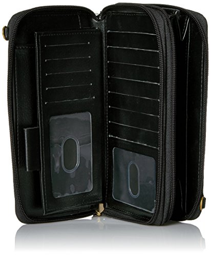 Studio : Buxton Publisher : Buxton Binding : Apparel Product Description Embossed man made material with pebbled synthetic trim and satin gold tone fashion logo/hardware nordic flight ultimate organizer® features two full zip-around compartments and an outside slip pocket. The front compartment features multiple credit card slots and i.D. Window, utility pockets, a removable checkbook with pen holder and an additional i.D. Window. The second compartment features an interior zipper pocket, multiple credit card slots and a detachable shoulder strap. 0