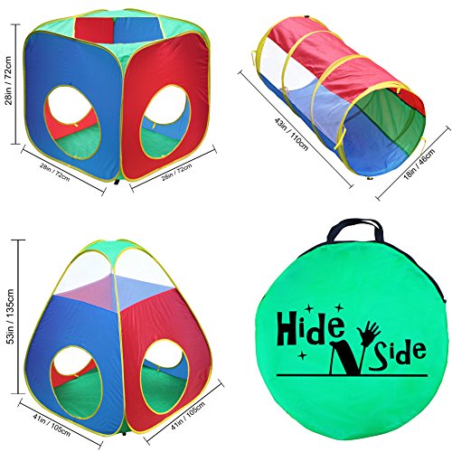 Hide-n-Side Tents and Tunnels are the perfect place to practice crawling, sensory processing and coordination activities. Also, a great place to just hang out! So let your kid's imagination run wild in these vibrantly-colored, friendly-faced play houses and tunnels! They make a lovely, bright and inviting place for kids to play, and occupy themselves for hours! You will see just how creative they can be with all the many uses they will come up with! Children love to explore, play pretend inside, hide-and-go-seek, and even to use them as a refuge from the light, noise and hustle of a busy home or classroom. The tents and tunnels collapse for easy storage and store compactly and conveniently in the accompanying bag, making them suitable for small homes, apartments or daycares. Ideal for indoor and outdoor play, and perfect for ALL occasions! Great for Birthday parties and sleepovers and for the daily afternoon routine and weekends! Give it as a Birthday gift and Christmas gift to 1, 2, 3, 4, 5, 6, 7, or 8 year old boys or girls. Your little pet dogs and cats will love it too, as their pet play tunnels. Made from polyester with a wrapped steel spring frame sewn safely and securely into a fabric sleeve. These crawling tents and tunnels are designed for years of play!Feature