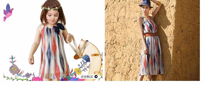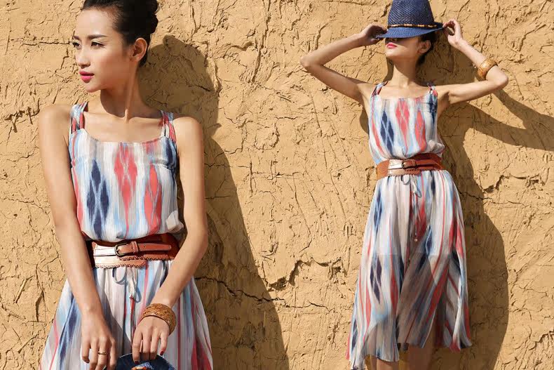 吊带 / 中腰 / 后上松紧 / 抽绳腰带 绳头穿木珠 / 印花雪纺 / 乔其纱里衬 / A字裙摆 左侧开叉