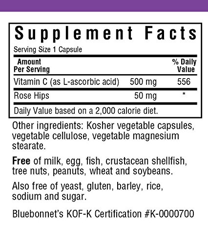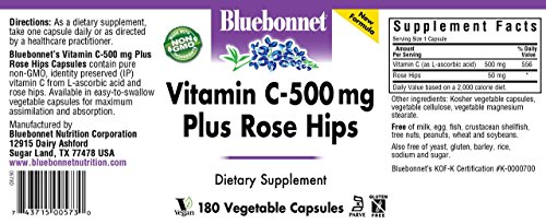 Bluebonnet's vitamin c plus rose hips provide vitamin c from pure l-ascorbic acid, rose hips and citrus bioflavonoids from fresh oranges, lemons, tangerines, grapefruit and limes, plus hesperidin. Available in easy-to-swallow vegetable capsule for maximum assimilation and absorption. Vitamin c helps tissue and bone grow and repair themselves. It can also help the body absorb the mineral iron. Vitamin c can also help protect against heart disease, prevent scurvy, and decrease total and ldl cholesterol and triglycerides. Rosehips are another source of vitamin c.Feature