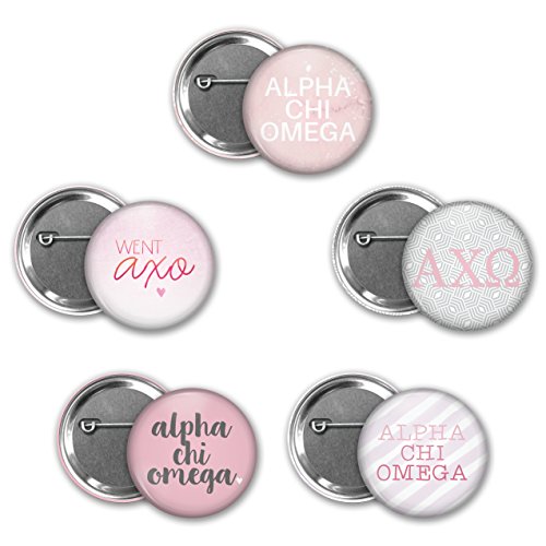 Binding : Apparel Product Description Our fun filled Alpha Chi Omega sorority buttons set of 5 include all the must have, sorority sugar for your life. Made with lots of love, these 1-3/4inch round buttons are made with mylar shells and pinned backs! Show your sorority pride by pinning these on your back pack, tote or other pencil bags. Use them for sorority swag, new member gifts, or even for recruitment name tags! These Alpha Chi buttons make a perfect addition to any bid day bag or gift basket for your little. Note: Due to color variations on monitors actual product colors may vary slightly. 0
