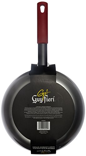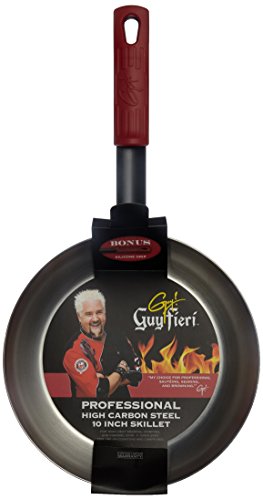 Guy Fieri products incorporate style with unique function built expressly to the specifications of the famous chef and restaurateur. This carbon steel 10-inch fry pan has a durable carbon steel body and is perfect for searing, frying, and browning. The silicone grip keeps handles cool when used on the stove and is removable for use in the oven. Perfect for all sources of heat including inductions. Oven Safe to 500 degrees F (260 degrees C) without silicone grip, and 350 degrees F (180 degrees C) with silicone grip. Hand-wash with warm water and a mild detergent; rinse and dry immediately.Feature