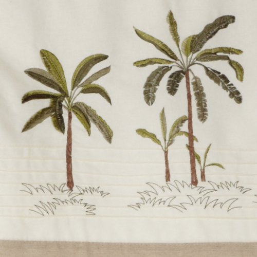 Escape to your boudoir with this tropic, yet soothing collection. Stylized palm trees adorn the comforter in a white banding detail with pleated accents. A classic stripe graces the pillowcases enhanced with a fashionable vertical border featuring an array of grouped palm trees. Decorative pillows uniquely applied button, oversized leaf, and pleated detailing enhance the collection. Break away from everyday sheers and curtains and add some interest with window treatments featuring coordinating palm tree designs.Feature