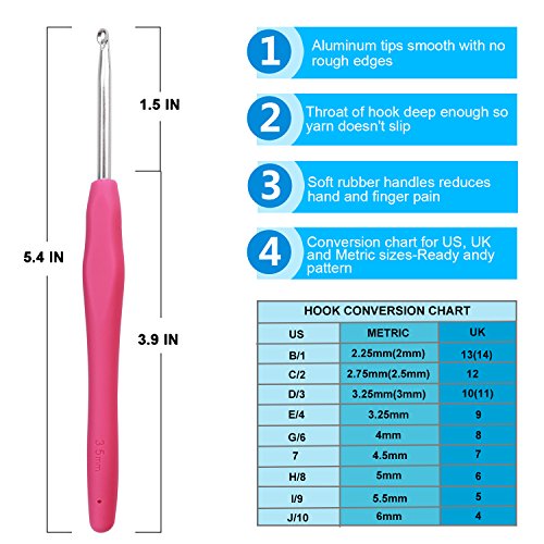 - HIGH QUALITY-This set of crochet hooks are with soft anti-slip rubber handle,easy grip and feel comfortable. With aluminum anti-resistant needles, Durable and last long,you are no longer need another other crochet hooks