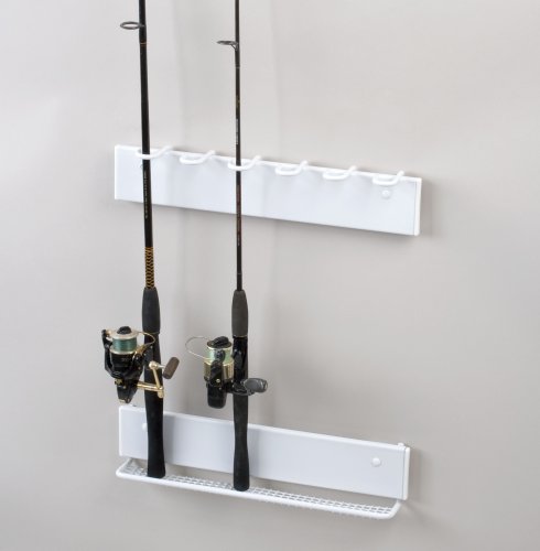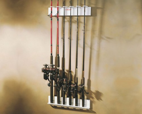-. Feature : Wall-mount fishing pole rack; holds 6 rods / Neatly organizes fishing rods in a minimum amount of space / Made of sturdy, heavy-gauge, solid steel for optimal support / Durable epoxy finish for corrosion resistance / No assembly required; easy installation with provided hardware