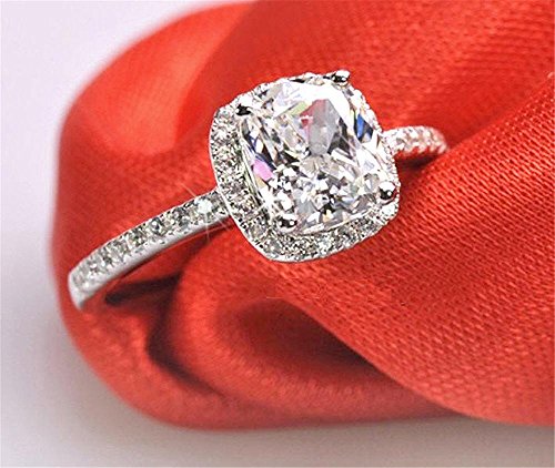 -. Feature : Contemporary halo designer ring set, featuring a 2 carats 7x8mm) radiant cut simulated diamond, framed by sparkling 1mm stones. The center piece is slightly raised so that you can fit in any band underneath to wear together. (Ring and band set is available in another listing.) / The main stone is a top grade simulated diamond, with 74 facets. Hence, it is full of fire with explosives of sparkles. It sparkles even in dim light, just like a real diamond, which is something that CZ and crystal could not. The side stones are all brilliantly cut with hearts and arrows cutting. / With excellent craftmanship and with stones cut like real diamonds, this ring is very realistic looking. / Metal: Stamped Solid 925 Sterling Silver. Plated with anti tarnish platinum for extra shine and protection. It will not turn your finger green like cheaply plated rings. / Comes in formal ring box and company's tag.