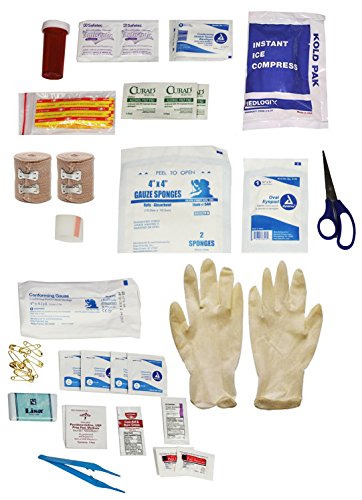 - Feature : Survial Bag Includes: Compact Bag + First Aid Kit Contents Come In Poly-Bag. / General Purpose First Aid Kit Content is a great kit for everyday use, Can Be Placed in any Backpack, Bag, Survival Kit, Car and Home. / Contents are all USA made. / Kit Contains: 1-Hand soap, 1-Bandage gauze 2"x4.1yds, 2-Sterile sponges 4"x4", 16-Bandage strips 3", 1-Tweezers, 1-Pill bottle, 1-First aid instructions, 1-Pair latex gloves, 1-Triple antibiotic, 4-Alcohol wipes. / 4-Antiseptic wipes, 1-Bandage gauze 4"x4.1yds., 2-Elastic bandage 2", 1-Eye pad, 1-Ice packs, 1-Scissors, 4-Pain reliever/Aspirin, 6-Safety pins, 1-First aid cream, 1-Tape 1", 2-Iodine wipes, 4-Clean wipes.