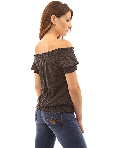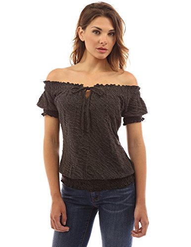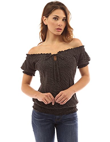 PattyBoutik Smocked Off Shoulder Short Sleeve Blouse. Model in pictures is 5 feet 8 inches (173cm) tall wearing size S.