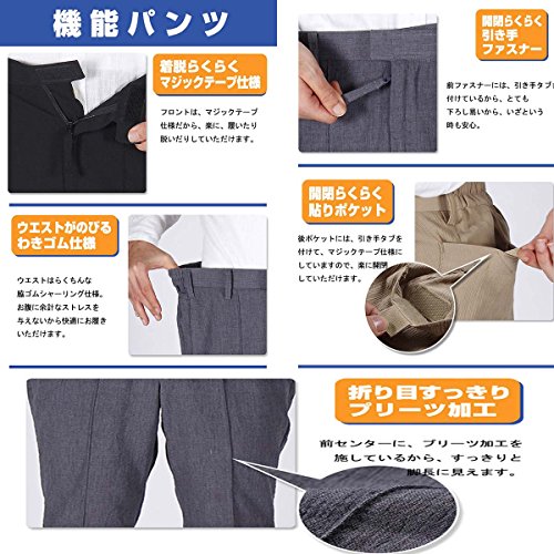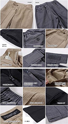 -. Feature : 素材は、さらりとして通気性に優れ、清涼感のある生地感の快適な楊柳(ヨウリュウ)生地を使用。 / 細かい経シワ が入っているから 触れる面積が少なくなり、ベタつく梅雨の季節や暑さの厳しい夏にも快適にご着用いただけます。表情のある生地が、ほどよいカジュアル感演出 / ビジネスとしてもカジュルとしても、 リラックスウエアとしても活躍( シニア向け シニアファッション 男性 紳士 高齢者)父の日 の お父さん への プレゼント にもぴったりズボン。 / サイズは商品説明に記載させていただいております。 / ウエストマジックテープやファスナーの箇所に紐も付いているので介護パンツとしても優秀です。もちろんご家庭での洗濯ができるウォッシャブルのズボンです。 素材:ポリエステル65% 綿35%