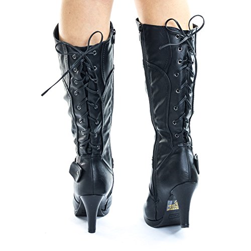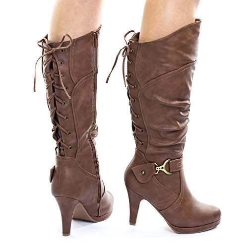 Binding : Apparel Product Description About This Shoes :These western inspired boots features faux leather fabric, a mid calf shaft with tapered heel, low platform, almond toe, multi laired with stitch details, decorative harness with antique brass buckle, corset inspired lace up closure on the back of the shaft, the front of the shaft is slightly higher than the back and a full side zipper. Brand - Unknown Colors Available: Black, Tan Occasion: Casual Shoe Type: Cowboy, Western Shoe Style: Cowboy, Western Inner Lining: synthetic Heel Height In Inches - 4 Heel Style - Block Toe Style - round-toe Platform Height In Inches - 0.75 Shaft Height In Inches - 12 Circumference Opening - 15 Strap Type - 0 Sole - manmade All Man Made Material unless otherwise stated. Computer/Phone/Table monitors might show color differently because of its quality or calibration, we suggest you look at the photo in at least 3 monitors if you need exact color match of your shoes. 0