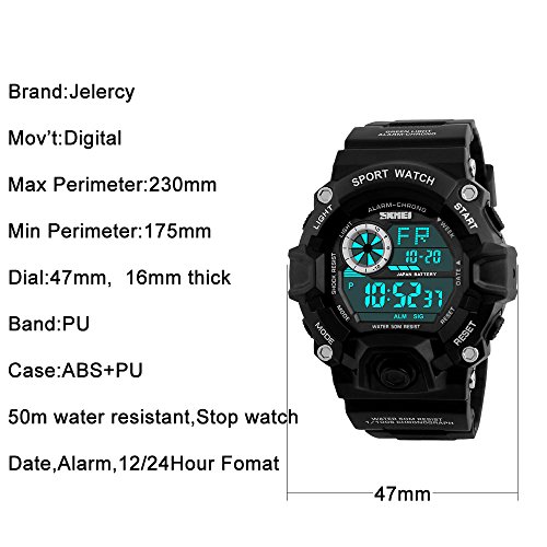-. Feature : Wrist Size:175mm/6.88inch-230mm/9.05inch;Dial diameter:47mm/1.85inch;16mm/0.62inch thick / Cool Outdoor Sports Watch:5ATM Waterproof;Stopwatch,LED Light;digital stopwatch, Hourly Time Signal;Alarm;Calendar;12/24 Hour Formats / Material:Battery code:CR2032;ABS CASE;PU Band;Stainless Steel Back and Buckle;Precise Movement;High Hardness Miror / Gift packing,A great gift for teenage boys\men;Available for Birthday,Children's Day,Christmas Day / Available for Running,Hiking,Climbing,Swimming(No Diving);NOTE:Please Don't Press Any Keys When Underwater;Please Dont Take It into Hot Water;Any Problem,Please Send Us an Email,We Will Solve Your Problem Soon.Thanks!