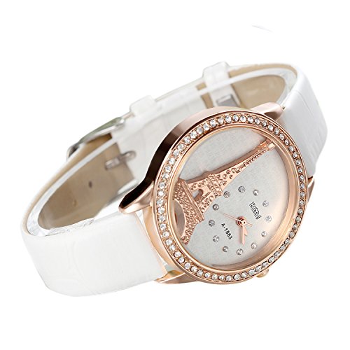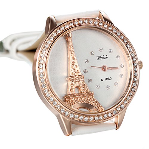 -. Title : Avaner Elegant Bling Rhinestone Accented Eiffel Tower White Leather Analog Quartz Wrist Dress Watch for Girls Ladies Women