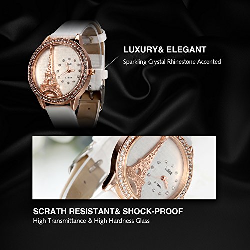 -. Feature : ✔ PRECISE TIME KEEPING: We only use high end Quartz movement providing precise and accurate time keeping. / ✔ LUXURY ELEGANT DESIGN- Sparkling crystal rhinestone accented, makes the watch more luxury and eye catching, reveals your elegant temperament and aristocratic tastes. / ✔ COMFORTABLE AND DURABLE: PU leather band which is soft, flexible and durable, great for daily wearing. / ✔ WATERPROOF FOR DAILY USE: Suitable for daily use, can withstand splash/rain. NOT suitable for diving, swimming, snorkeling, water-related work. / ✔ GIFT RECOMMENDATION: Delicate rhinestone accented with Eiffel Tower design, simple and grand, Combines quality, fashion, and value, it's a great gift for your lover, families and friends as Birthday, Valentine's Day, Christmas Gift.