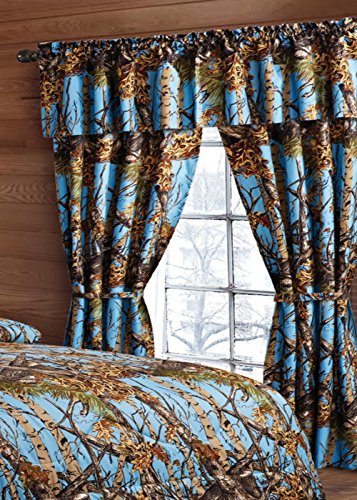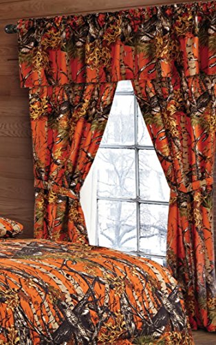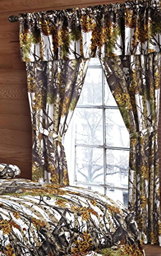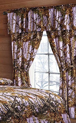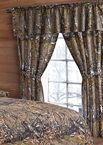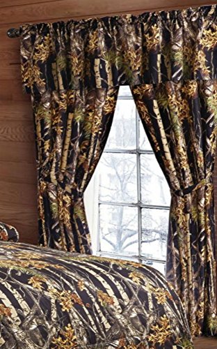 Woodland Camo pattern curtain set. Made of 100% Machine Washable Microfiber Material. Add a rustic touch to any room. Set comes with 1 Valance, 2 Curtain panels, and 2 Tie BacksFeature