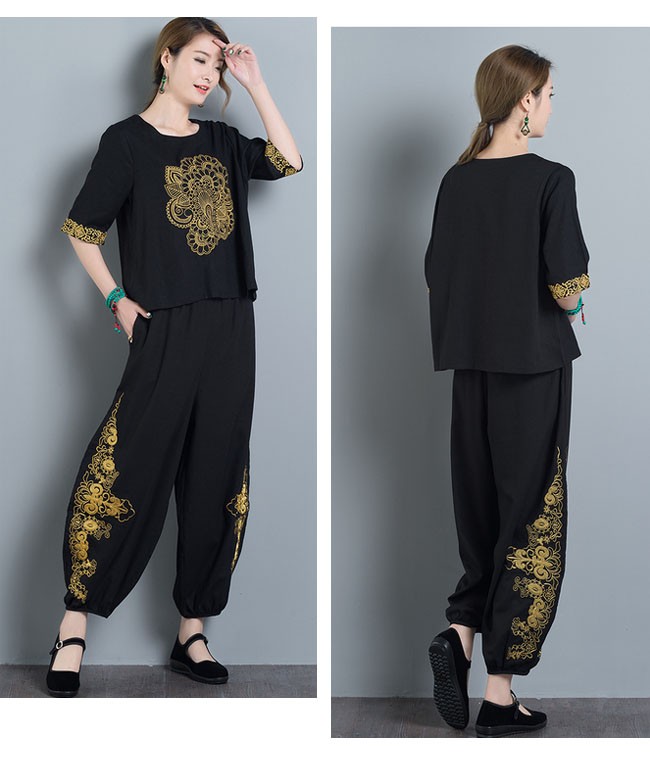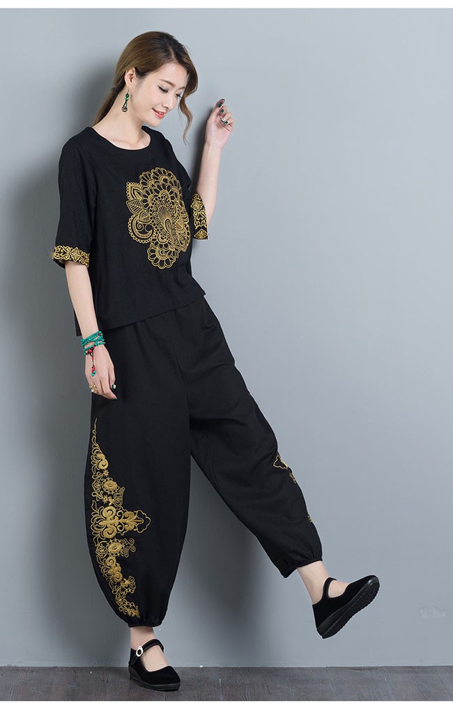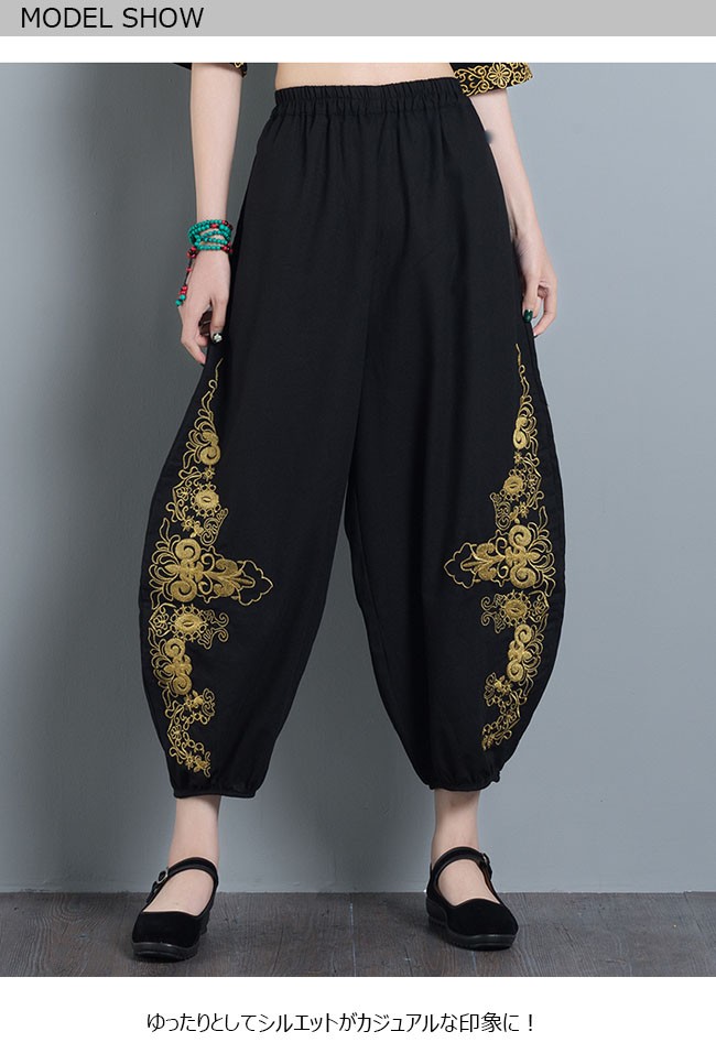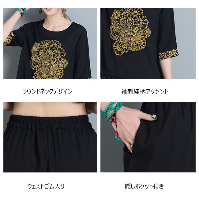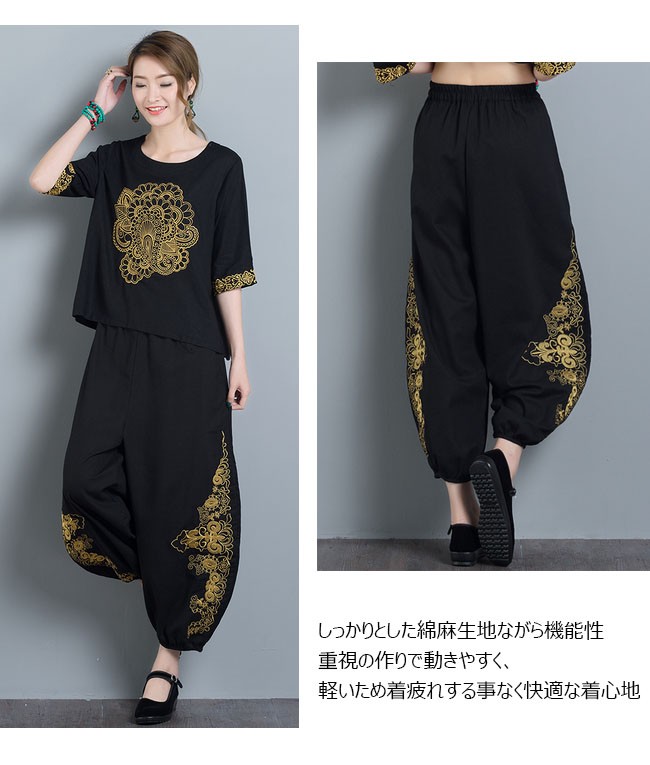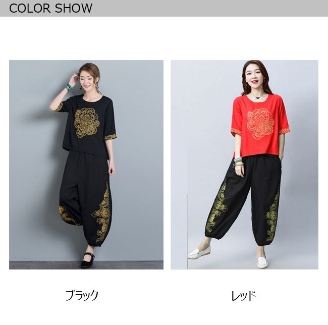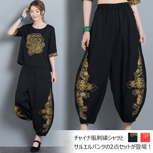 | 商品名 | 2点セット 刺繍セット チャイナ風セットアップ リネンセット セットアップ(Tシャツ+サルエルパンツ) レディース エスニック 民族風 ゆったり カジュアル |