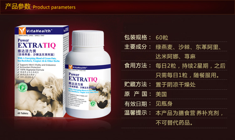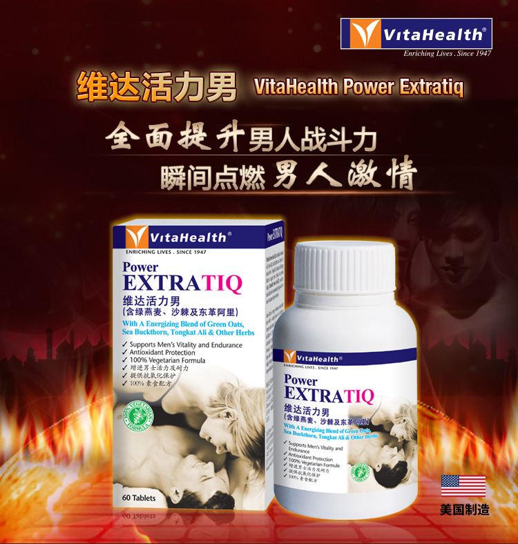 VitaHealth Power ExtraTiQ isan Improved Formula which combines the natural goodness of Green Oats, Sea Buckthorn and a blend of 3 natural herbs – Tongkat Ali, Damiana and Stinging Nettle to support men’s physical and mental vitality. This energizing blend of herbs work in synergy to helps maintain energy and vigor for general well-being.