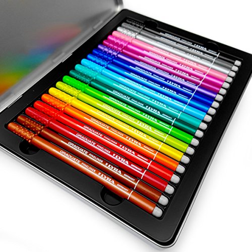 -. Feature : Pack of 20 assorted coloured Graduate Fineliners from Lyra. / Perfect for drawing, detailed colouring, writing, and underlining. / Comes in a sturdy metal tin, making the set ideal for taking to school and college. / Feature water-based inks, and synthetic, non-deformable nibs, for precise and clean strokes. / Made in Italy.