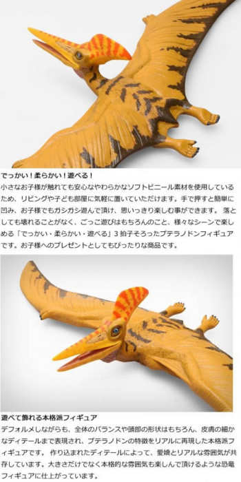 やわらか素材のあそべるフィギュア「ビニールモデル」からフェバリット史上最大級のでっかいプテラノドンフィギュアが登場しました。プテラノドンは最も有名な大型の翼竜の一つで、白亜紀の大空を支配していた空の王者として知られています。やわらかな素材を使用した開翼長60cmを超える大迫力の超ビッグサイズです。落としても壊れないので、どこでも思いっきり楽しめます。 |