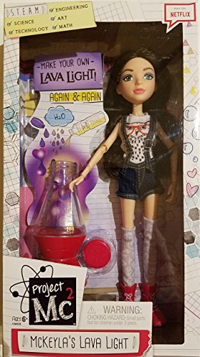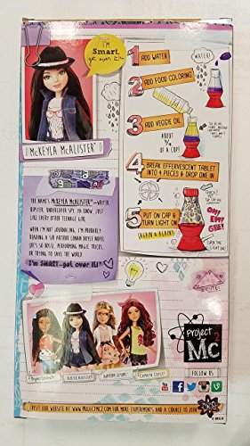 The name's McKeyla McAlister - writer, hipster, undercover spy. Ya know, just like every other teenage girl. I'm Smart...Get Over It! Project Mc2 is a team of four super-smart and seriously cool girls who use their love of science and their spy skills as they go on missions for secret organization, NOV8 (that's "innovate"!). They're real girls with real skills ready to take on anything. Now an original series, only on Netflix! Now you can perform an experiment at home with Project Mc2 leader, McKeyla McAlister. Make your own lava light just using safe household ingredients. Picking up S.T.E.A.M. with Science-Technology-Engineering-Art-Math: Molecules of water don't like to mix with molecules of oil because of something called intermolecular polarity. The oil stays above or separated from the water because oil is less dense than water. Next, when you add an effervescent tablet, it dissolves, creating a gas. As the gas bubbles rise, they take some of the colored water with them. Science is rad, right? Doll Set Features: - Comes with premium articulated McKeyla doll, dressed in a totally cool outfit that reflects her personality and individual style. Look closely -- so many fun details! - Also includes a fun science activity: 5" lava light with LED light to experiment again and again.Feature