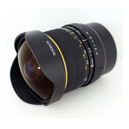 The NEW ROKINON 8mm Ultra Wide Angle Fisheye Lens with automatic focus confirm chip for Nikon is the most affordable 8mm Fisheye Lens in the market. It now includes an AE chip to confirm when the camera is in focus and to automatically sync aperture and exposure with your camera. It features the widest field of view over any other 8mm fisheye lens, and its build quality and optical construction are superb. The ROKINON 8mm lens is designed for Nikon digital SLR cameras with APS-C image sensors. For these types of cameras, it provides full-frame coverage - which means that pictures will cover the entire frame. It is also compatible with Nikon cameras that have a full-frame sensor. For cameras with full-frame sensors, the lens will produce pictures with a semi-circular image and close images will appear proportionately large for a dramatic effect. The ROKINON 8mm lens creates images with an expanded and exaggerated perspective and an extremely wide 180 Degree angle of view.Feature