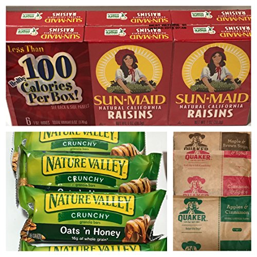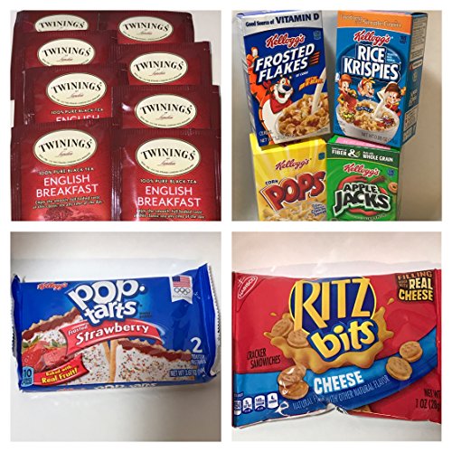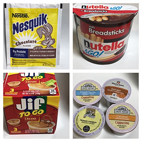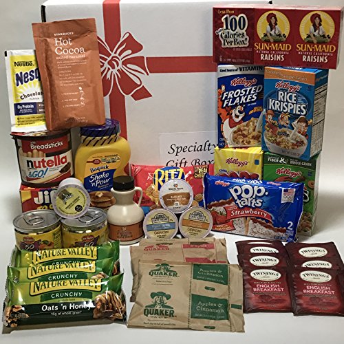 -. Feature : Be sure to check "THIS ORDER CONTAINS A GIFT" so that you can write a FREE message / Send This Box of Tasty Breakfast Treats to Your Son, Daughter, Mom, Dad, Grandpa, Grandma, Friend, Spouse, Niece, Nephew, Godchild..... / 34 Items in Each Box -- 1.8 oz Nutella & Go, 3pk. Jif To Go, Stawberry Poptarts (Pack of 2), 3.4 oz Anderson's Pure Maple Syrup Jug (Grade A), 4 Nature Valley Oats & Honey Bars, 2 Fruit Cups (1 Peach & 1 Mixed Fruit), and 4 K-Cups (French Vanilla Cappuccino by Grove Square, Caramel Cappuccino by Grove Square, Gloria Jean's Hazelnut, and Van Houtte French Vanilla) / Also includes: 4 Cereals (Corn Pops, Frosted Flakes, Rice Krispies, and Apple Jacks), 3 Oatmeal Packets (1 Maple & Brown Sugar, 1 Apples & Cinnamon, 1 Cinnamon & Spice), 8 Twining English Breakfast Tea Bags, 1 oz Ritz Bits Cheese Crackers, 5.1 oz Bisquick Shake & Pour Buttermilk Pancake Mix, 6 pk of Sun-maid Raisins, a Nesquik Packet, and a Salted Caramel S.T.A.R.B.U.C.K.S Hot Cocoa Packet (just add hot milk!) / All packed in a white, recloseable gift box (no cheap basket or flimsy cellophane)! No need for gift wrap!