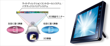 ・ カメラ背面の2.8型液晶モニターは、左目・右目に届く光の方向を高速かつ高精度に制御し、両目にそれぞれ別の画像を投影する「ライトディレクションコントロールシステム」を採用。パネル本来の解像度を生かしたまま、ちらつきの無い自然な立体感を裸眼で得ることができる。