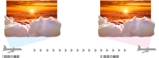 ???(2) 「3D時間差撮り」...電車や飛行機などで撮影者が移動しながら、視点の異なる2枚を連写することで、超遠景を立体的に写し出すことができる機能。飛行機から見た雄大な雲海や山岳の風景などを3D撮影したい時に最適。