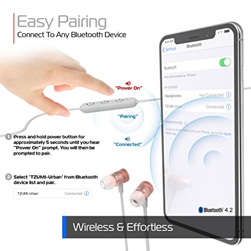 -. Binding : Electronics -. Brand : Tzumi -. Color : gold/rose -. EAN : 0841351155250 -. Feature : On-The-Go Charging - A single 1.5-hour charge provides the Urban Series Earbuds and their powerful Lithium Polymer 65 mAh battery with up to 6 hours of HD Bluetooth 4.2 play and talk time for any iOS or Android smart device. A Micro-USB cable is provided for easy charging wherever a standard USB port is available, so you will always have enough power for even your longest commutes. / Conveniently Magnetized - The Urban Series Wireless Earbuds are designed with magnetic power to enforce that the pair remains stuck together when not in use (so they never get lost and separated in a messy bag). Unlike larger headphones that might be cumbersome during a commute, they are made to wrap around a user's neck like a necklace, and when done so they remain stable and easily accessible. / Customized Comfort - Each pair of Tzumi Urban Series Wireless Earbuds comes with three sizes of soft interchangeable silicone tips which can easily be switched out to provide you with the best fit for your ear. By using the most approP.R.Iately sized tip, you'll receive a better noise-canceling effect tailored to your body. / User-Friendly Controlling - The Urban Series Wireless Earbuds are designed for easy handling during a busy day: users can make their calls and play/pause with the touch of three large buttons for volume and playlist control. / The Tzumi Promise - At Tzumi, we are committed to providing you with the very best in consumer electronics products. We're convinced you will be happy with your Urban Series Wireless Earbuds, but if you are unsatisfied for any reason, please contact us directly so that we can be of assistance. -. Label : tzumi -. Manufacturer : tzumi -. MPN : 5525AMZ -. PartNumber : 5525AMZ -. ProductGroup : Speakers -. ProductTypeName : HEADPHONES -. Publisher : tzumi -. Studio : tzumi -. Title : Tzumi Urban Series Wireless Earbuds – Rechargeable Magnetic Wireless Stereo Earphones with Bluetooth V4.2 Technology and Built-In HD Microphone – Rose Gold -. UPC : 841351155250
