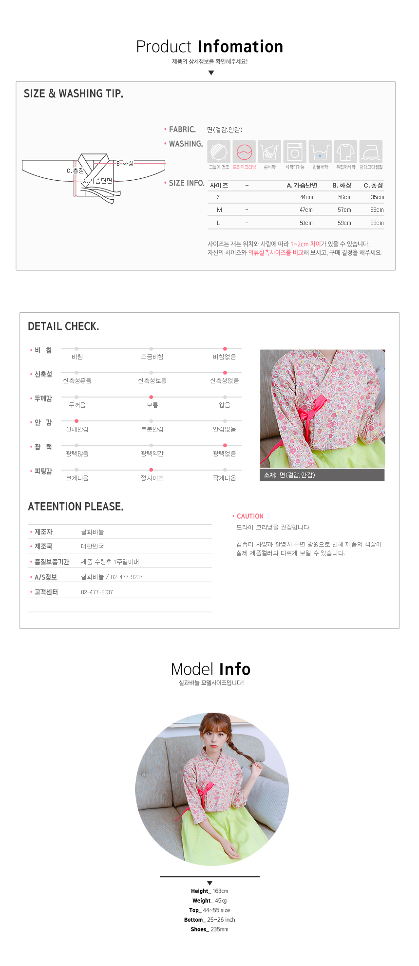 [실과바늘]생활한복 저고리 - 칠부 첫사랑 S,M,L