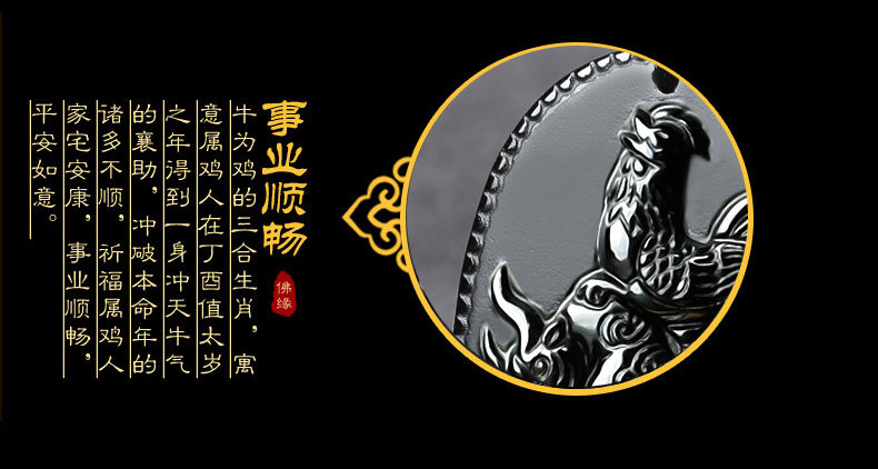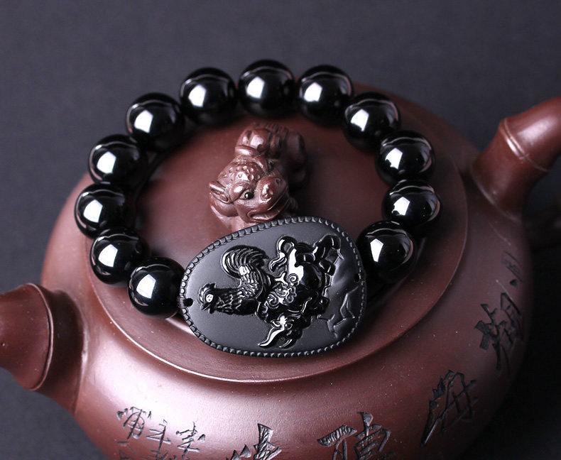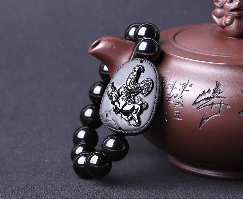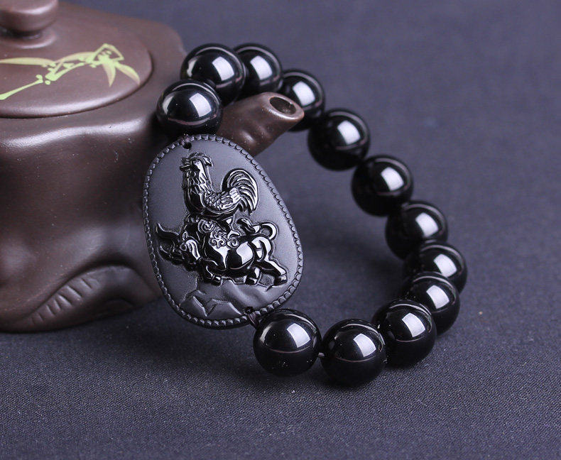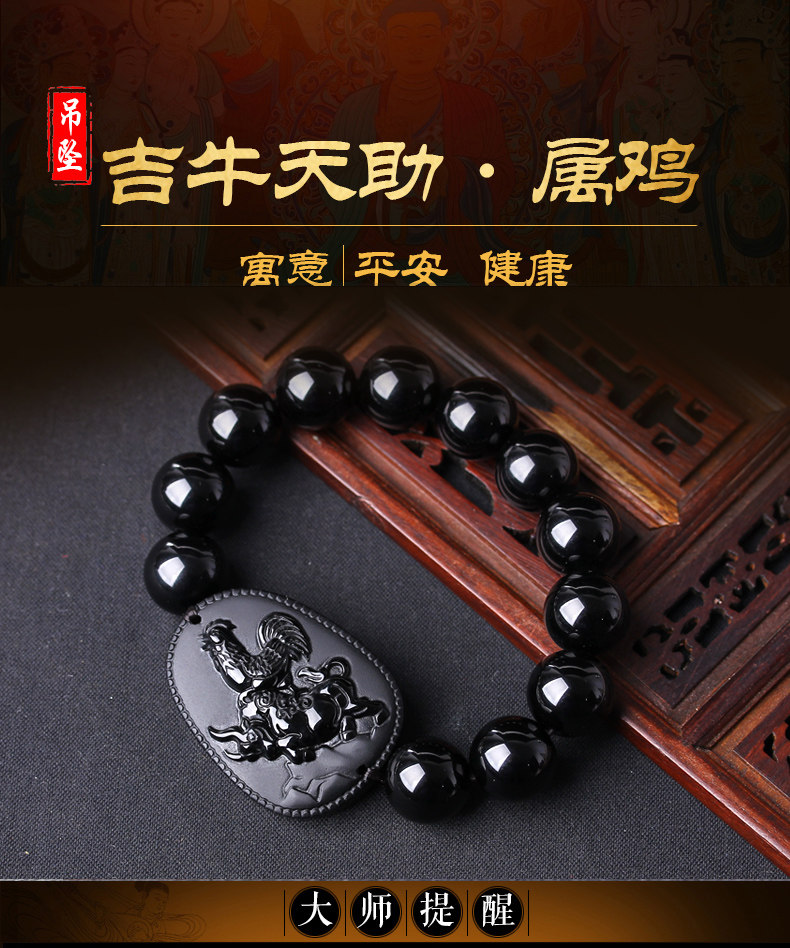 生肖属鸡本命年吉祥物吉牛天助黑曜石三合太岁金轮莲华手链