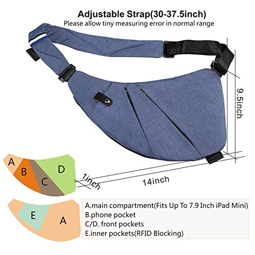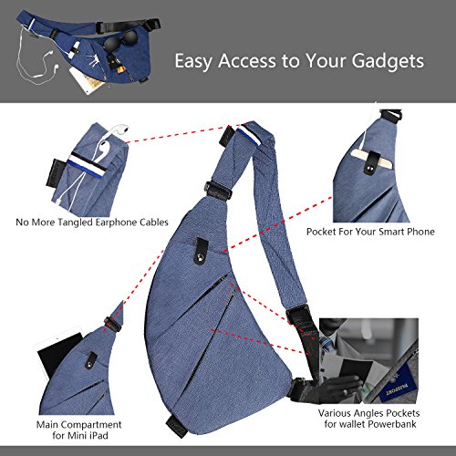 ★Organized Sling Bag Backpack: Multiple Pockets at Various Angles, easy access to all your gadgets(such as smart phone, earphone, tablet, passport holder, wallet, keys, power bank, charging cable, or so on). Compartment: 1*main zipper pocket(fit up to 7.9 inch iPad mini), 1* magnetic snap phone pocket, 2* front zipper pockets, 1*inner zipper pocket(RFID Blocking, safeguards your credit cards, ID card and personal information against identity theft)