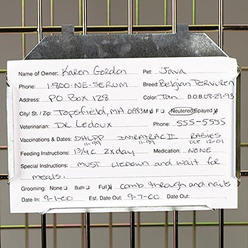 Studio : UnBranded Publisher : UnBranded Binding : Misc. Product Description Dog Kennel Care Card HoldersThese Metal ID Card Holders display vital information clearly and can't be knocked off the cage by pets. For use on ProSelect crates and cages. Metal ID Card Holders are perfect for clinics, animal hospitals, grooming shops, shelters, and rescues.Designed for use with ProSelect cages and cratesThird hook to prevent pets from removing the holder from the crate or wire kennel doorsHeavy-stock aluminum will stay attached to any standard cage.Kennel Cards are available and sold separately.Material: Heavy-duty aluminum Sizes: 3 x 5 and 4 x 6