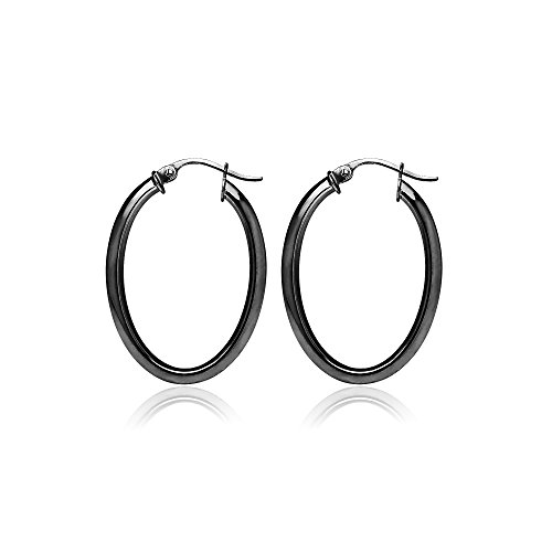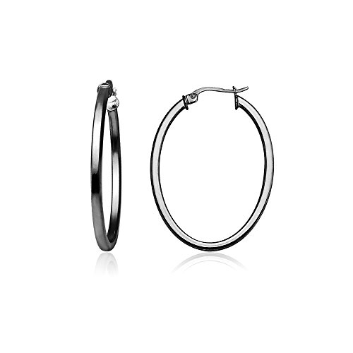 These hoops are 2mm in the width and 20mm in the length. They are oval shaped and feaure a square-tube design. They are made of .925 black flashed sterling silver.