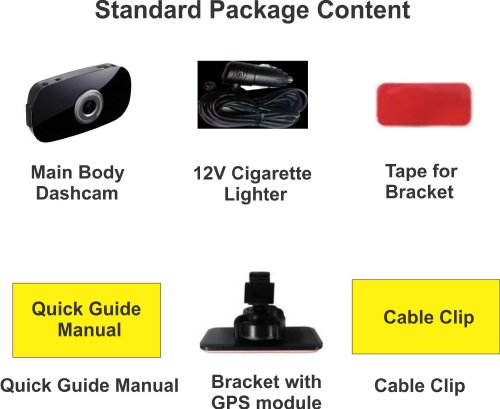 Contents of package: main body dashcam, external GPS logger module, SINTECHNO cd viewer player (run on Microsoft windows XP and 7 only), dc 12v cigarette power adapter