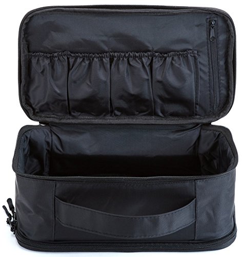 10.5”L x 5”W x 5.5”H SIZE with large main compartment offers more room for full-size mousse, hairspray and shampoo than other bags. Two large external zipper compartments protect your phone, keys and toothbrush.