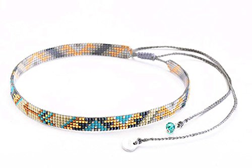 Delicate seed beads are beaded in a narrow band in shades of blue, teal, grey and gold-tone colors