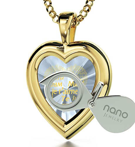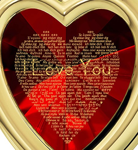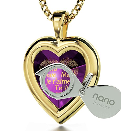 Love necklace inscribed in 24k gold with I love you in 120 languages, on to a heart-shaped cubic zirconia gemstone. The I Love You necklace, is beautifully inscribed using innovative technology, allowing us to write tiny text under the surface of the gemstone. The stylish cubic zirconia heart pendant measures 0.6 inches, 16mm and is prong set into a gold plated heart-shaped frame measuring 0.7x0.96 inches, 18x24.5mm. Available in a beautiful choice of colored cubic zirconia stones, you're bound to find the perfect gift. Choose from the following alluring cubic zirconia color choices; enticing purple, romantic red, classic black or timeless clear white crystal colored cubic zirconia stones. The heart pendant beautifully rests below the lines of a gold filled rolo chain measuring 18 inches, 45cm. If you can't say it enough, say it in 120 languages! A romantic anniversary gift idea for any loved one; wives, girlfriends, best friends, mothers or a special treat just for you!Feature