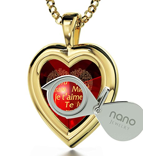 Love necklace inscribed in 120 different languages in 24k gold onto a red cubic zirconia gemstone heart-shaped pendant, 0.6 inches, 16mm, prong set into a gold plated frame measuring 0.7x0.96 inches, 18x24.5mm, including the bail.