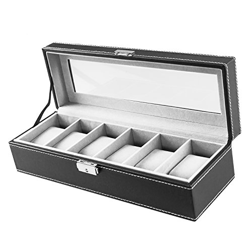 Professionally display expensive brand name watches with this modern inspired jewelry organizer case. Includes 6 rectangle slots to hold your watches and other small jewelry such as bracelets, earring, charms and necklaces. Includes a key for more security.