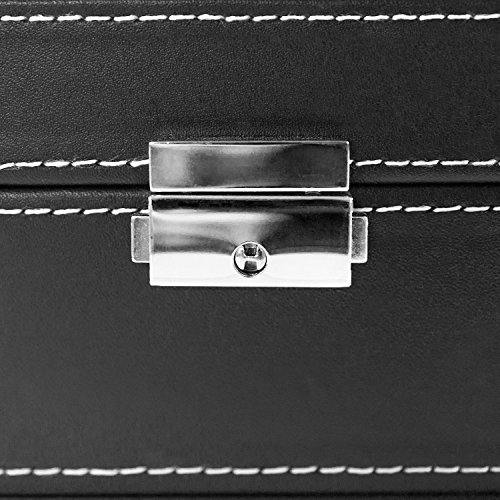 The inside of the jewelry case compartment slots is lined with soft grey velvet material that give it a modern look. Outer faux leather trim has white thread stitching wrapped around the top and bottom of the box. Features a see through clear top lid to show to easily choose a piece from your beautiful collection.